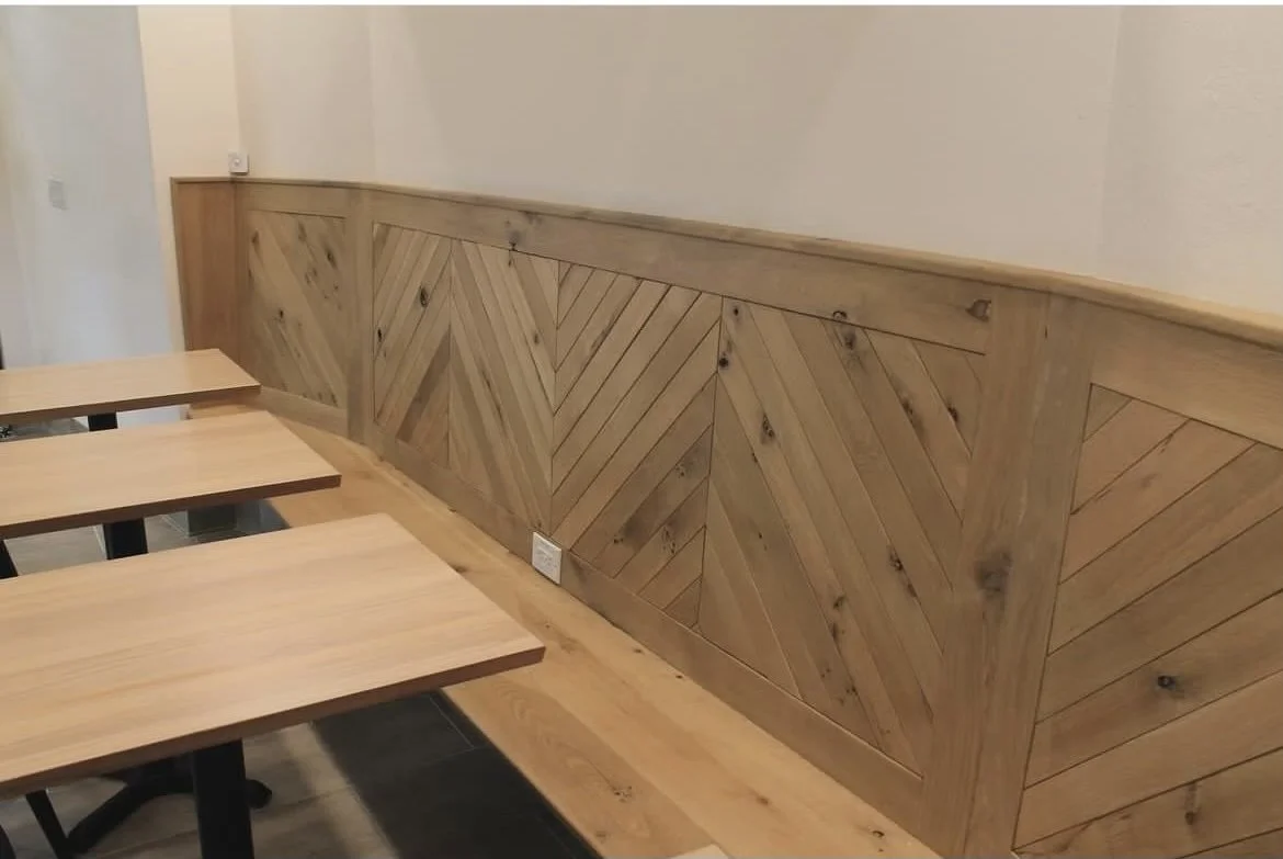 To meet our client's desire for uniqueness, we crafted a distinctive row of four booths, complete with matching tables. Additionally, we added a long white oak countertop by the front window, serving as an eye-catching feature and practical workspace.